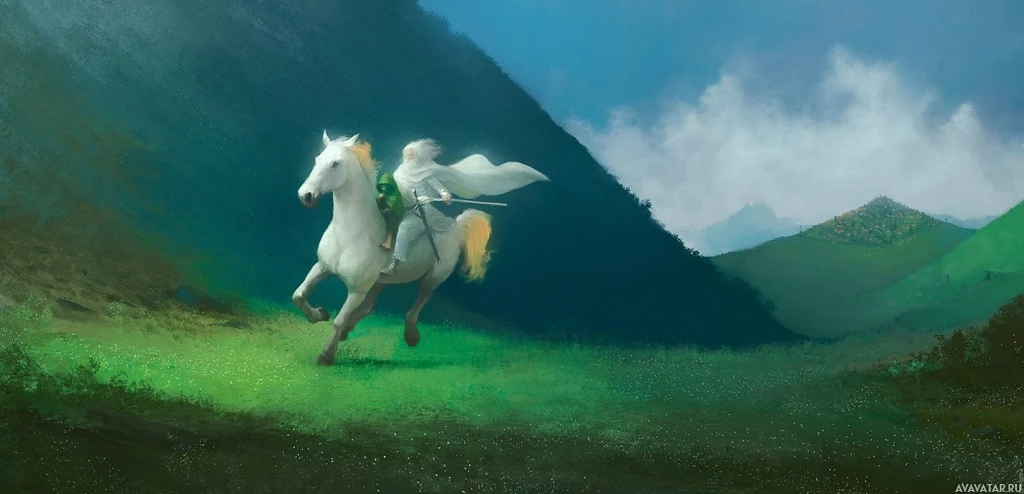The image depicts a scene from Middle-earth, featuring a character riding a horse. This character is recognizable as Gandalf due to his