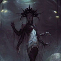 The image depicts a fantasy-themed scene featuring a figure that appears to be a humanoid with elongated ears and an antler-like structure on its head. This character is dressed in black and white, with what seems to be a dark, ethereal or otherworldly atmosphere surrounding them. The background is predominantly in shades of dark grey, while the figure stands out with contrasting lighter colors. The artwork has a moody and dramatic feel, and it could be related to various fantasy genres such as horror, gothic, or