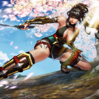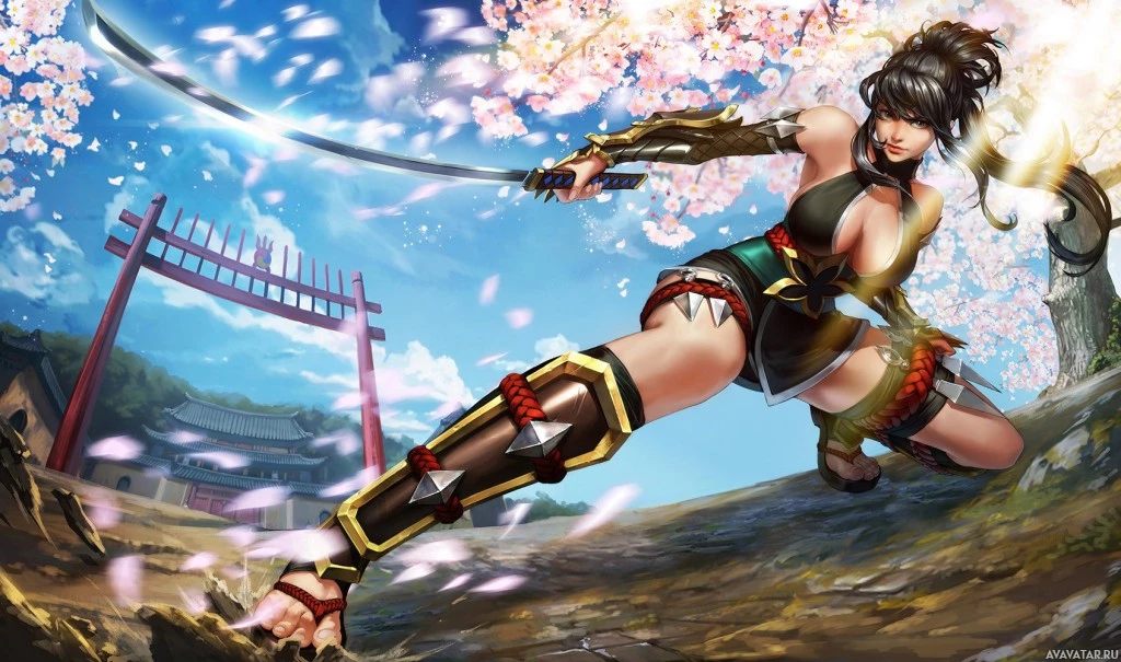 action stance, suggesting she might be involved in some sort of battle or adventure. The background includes cherry