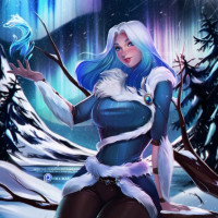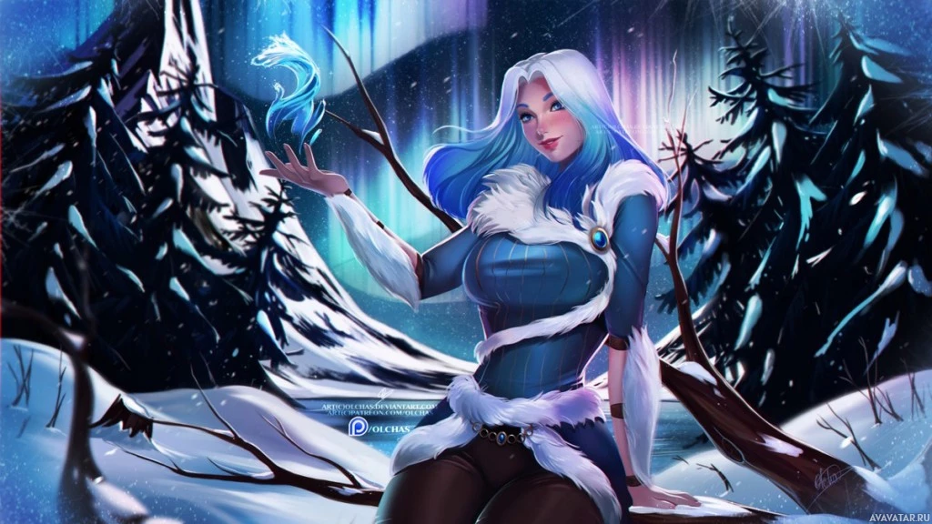 blue hair and what appears to be a winter theme. She is sitting among snow-