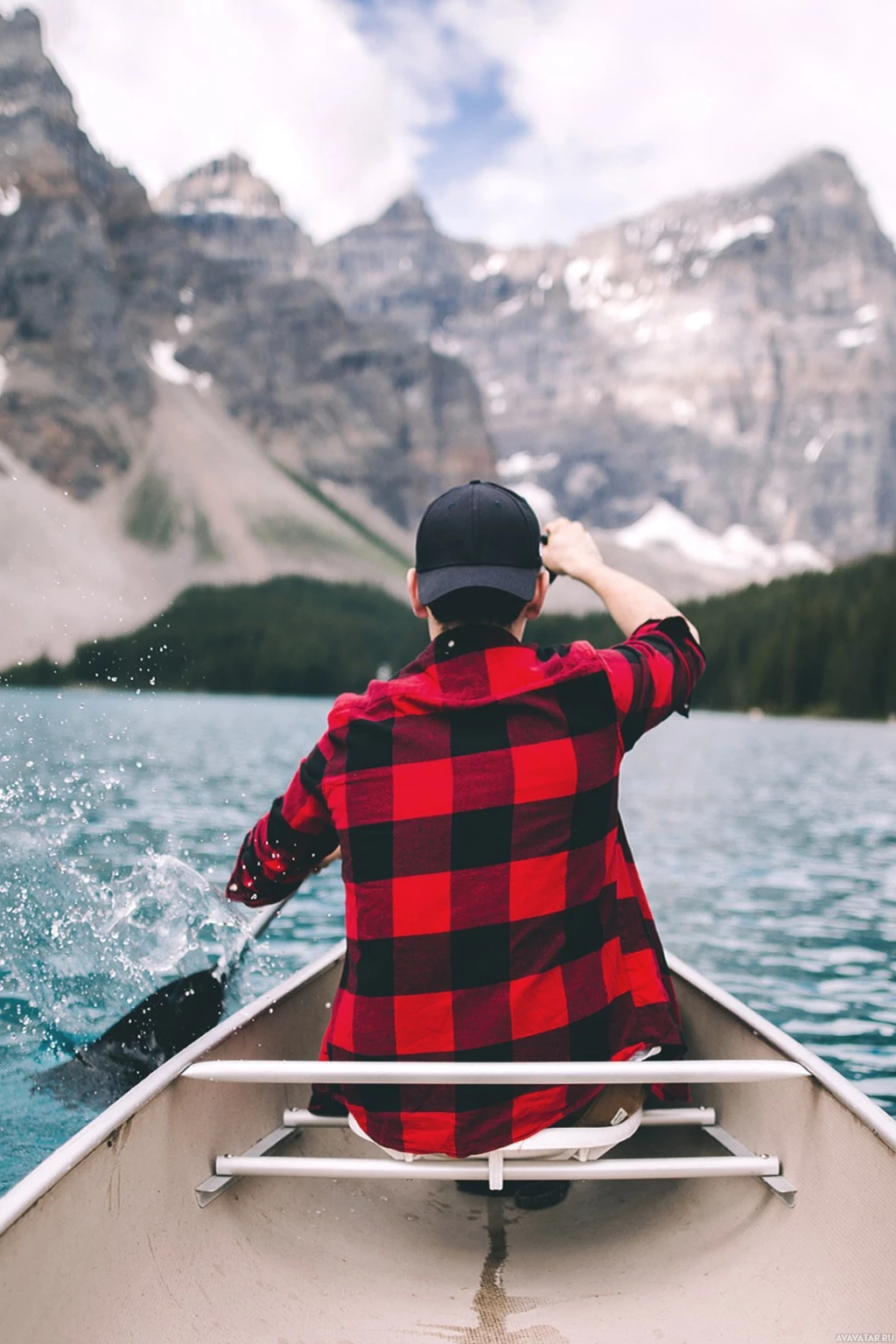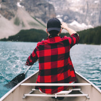 plaid shirt and appears to be looking out onto the water, possibly enjoying the scenery around them. The background features a picturesque landscape with mountains, suggesting that this might be a location known for its