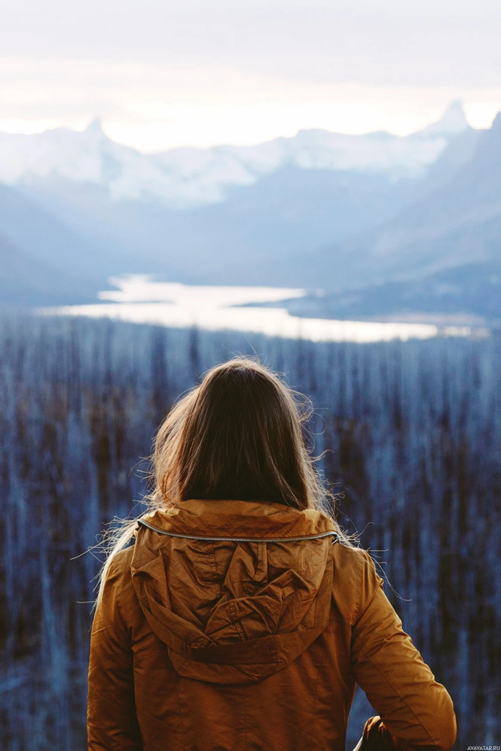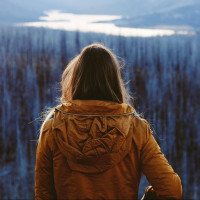 the soft lighting. The individual appears to be facing away from the viewer, looking out at the scenery. They are dressed in warm clothing suitable for cold