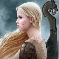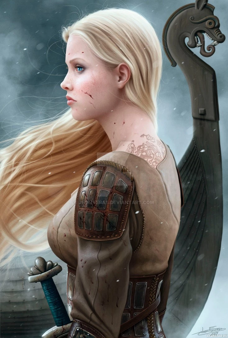 long hair and is wearing what looks like armor with a chainmail top. In her hand, she holds a sword, suggesting she may be a warrior or fighter in the context of the image. The background suggests a cold or snowy environment, which adds to the atmosphere of the scene.