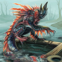 a mix of reds and blues, giving it an intimidating appearance. The creature seems to be in water or near