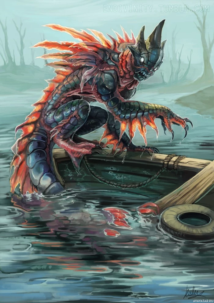 a body of water, possibly on the edge of a boat. This kind of artwork falls under the category of fantasy because it depicts a monster that does not exist in