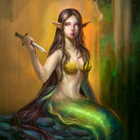 body structure. The artwork has a surreal quality to it, with elements that may not be typically found together in reality, such as the mermaid sitting on a branch and holding a knife. The overall style suggests it could be a character from