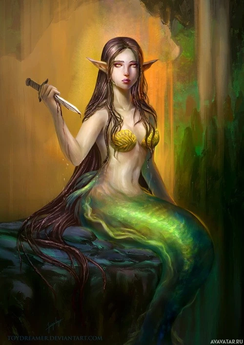red hair that cascades down her shoulders. The mermaid is holding a knife in her right hand, which suggests she might be portrayed as being prepared for battle or self-defense. Her tail is greenish with scales, indicative of a mermaid's characteristic lower