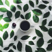 The image shows a cup of coffee with a cherry on top, surrounded by numerous green leaves arranged around it. This gives the impression that the leaves are floating or swimming in the cup. The setting appears to be outdoors, possibly on a table under natural lighting.
