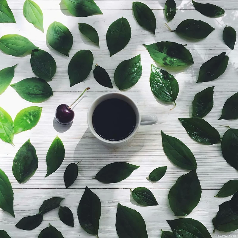 На картинке изображена чашка кофе с вишней сверху, окруженная многочисленными зелеными листьями, расположенными вокруг нее. Это создает впечатление, что листья плавают или плавают в чашке. Настройка, по-видимому, находится на открытом воздухе, возможно, на столе при естественном освещении.