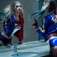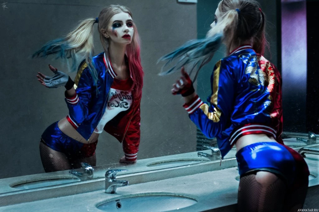 Harley Quinn, a character known from the Batman universe. This individual is in a mirrored space, reflecting their own image as they perform their makeup or look at themselves. Harley Quinn's costume typically includes elements like black and blue tights,