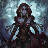 a female figure with pointed ears and red eyes, wearing elaborate armor and carrying weapons that resemble arrows or spears. The character has