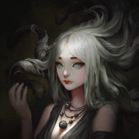 silver hair and is holding what seems to be a skull or an object with a similar appearance. She is wearing a dark outfit and has
