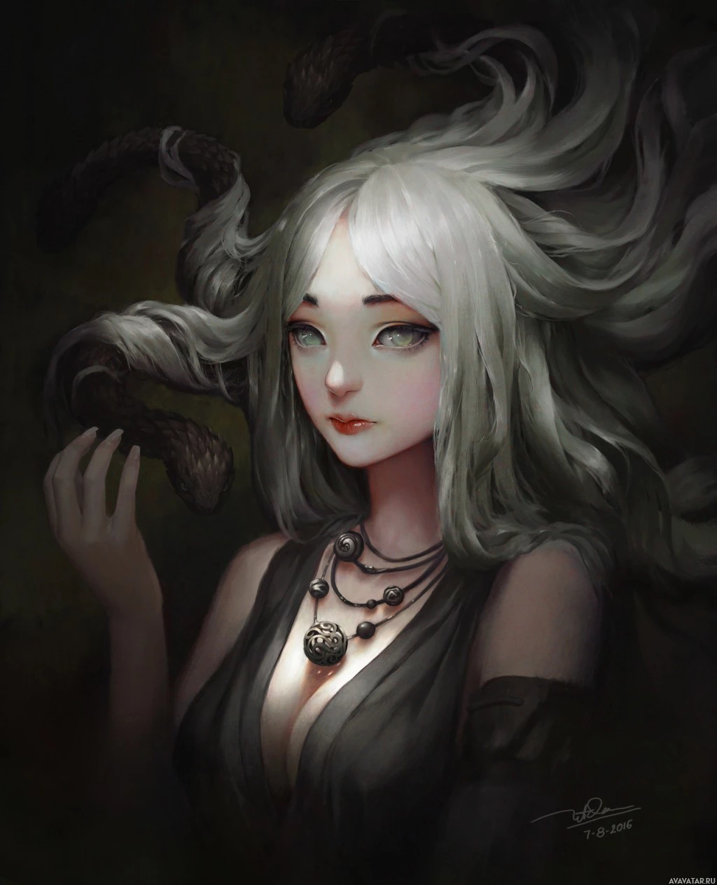 the mythological figure Medusa, often depicted as a gorgon with living venomous snakes in place of hair. This character has long, flowing