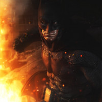 a serious expression, gripping a utility belt, and surrounded by explosions that indicate a dramatic or action-filled scene. The character's costume includes the iconic black cowl, cape, and