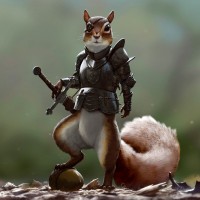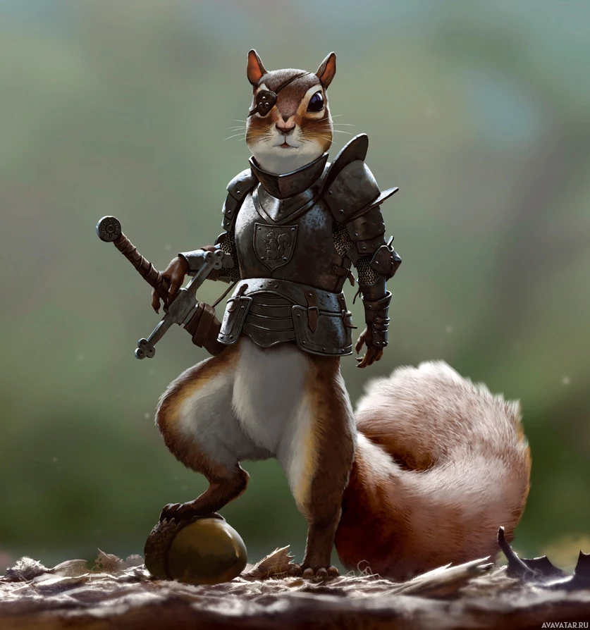 The image shows a stylized depiction of an animal, specifically a squirrel, anthropomorphized and dressed in armor. It's standing on what appears to be a pedestal or ball with one foot while holding a sword with the other paw. The setting suggests a forest or