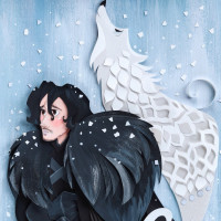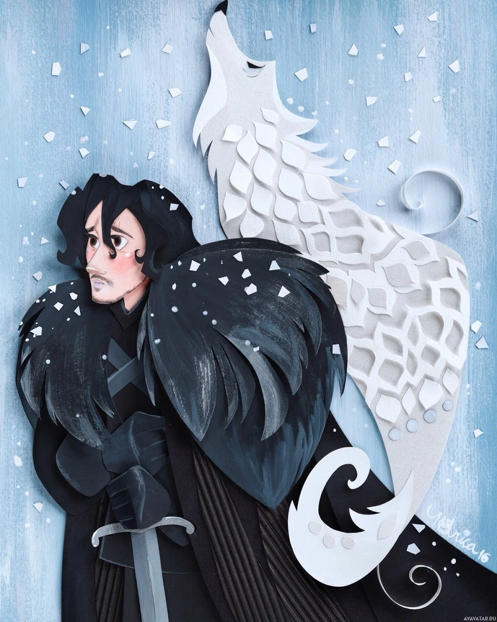 Game of Thrones," Jon Snow, standing behind a paper cutout of a wolf's head. Jon Snow is depicted with his distinctive