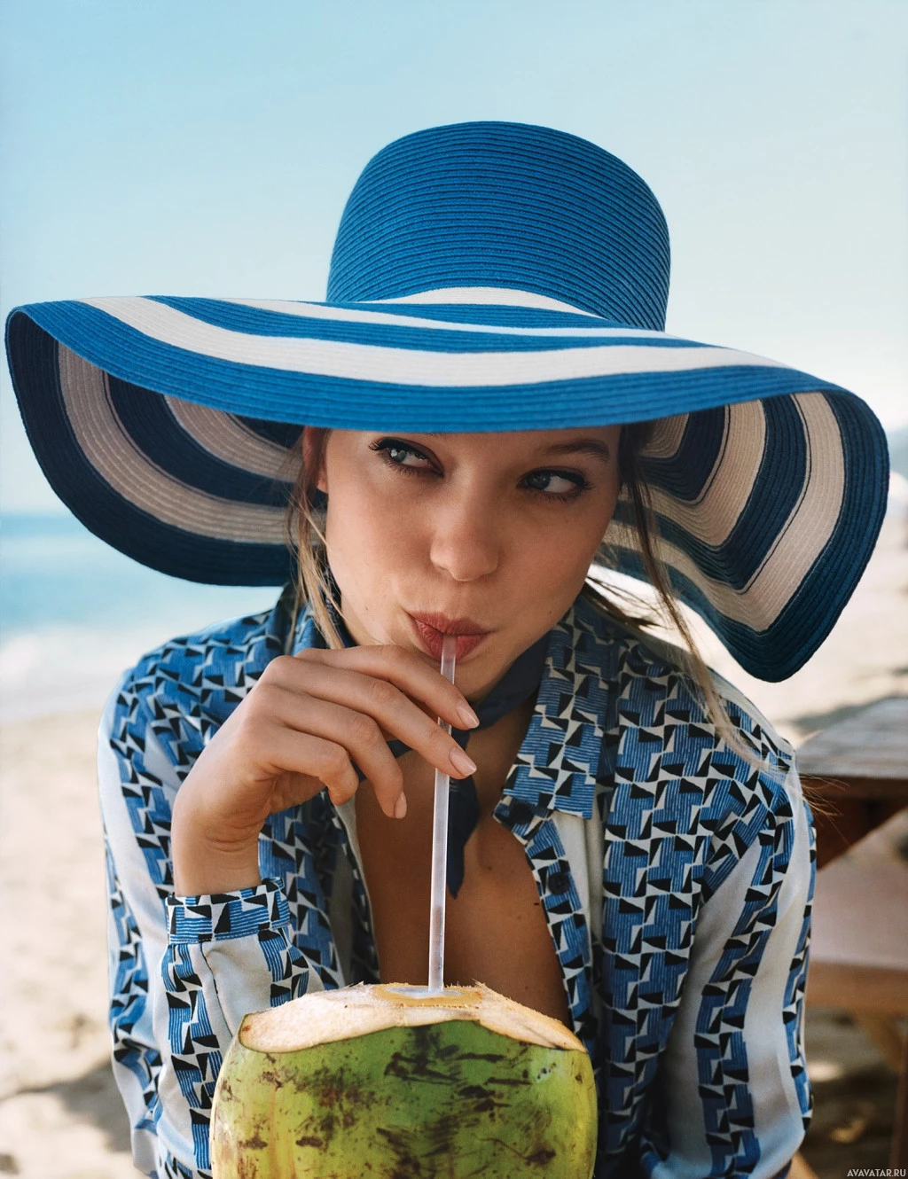 На снимке изображена молодая женщина в сине-белой полосатой соломенной шляпе. Она сидит на песке на пляже, держа в руке кокосовый напиток, который она, кажется, пьёт из соломы. Фон предполагает, что это может быть солнечный день у океана.