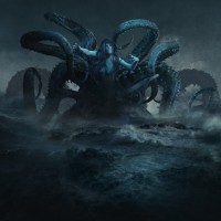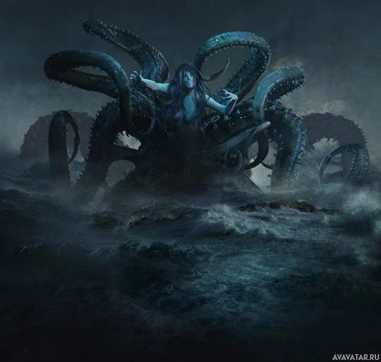 a stormy sea or waves. The woman seems to be embracing the octopus or interacting with it in a way that suggests she may have control over the creature or be a part of its world. This kind of imagery is often associated with fantasy and mythological themes, where creatures such as octopi are given human-like qualities or where humans have unusual interactions with