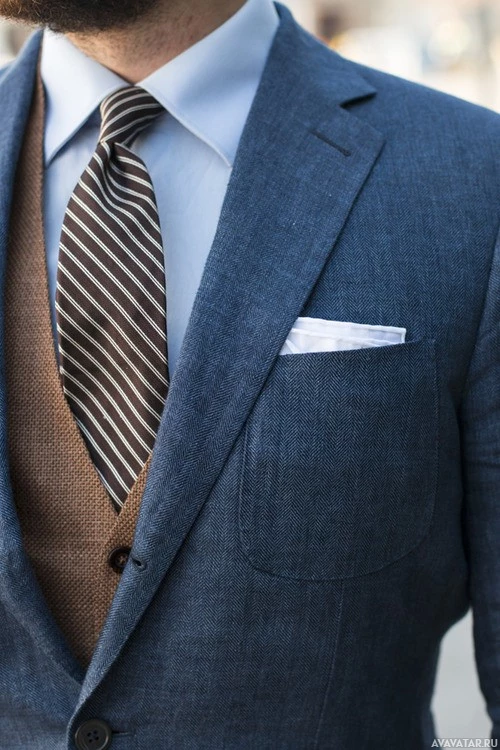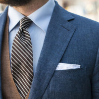 visual interest to his outfit. In one arm, there is a pocket square peeking out from the breast pocket, although it's not clearly visible what the fabric or color of