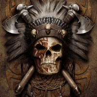 The image features a skull wearing an Indian headdress, which is typically associated with Native American culture. There are also various decorative elements around the skull, such as feathers and what appear to be weapons or tools, suggesting a theme of battle or conflict. This artwork could be related to music, as it might be