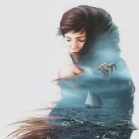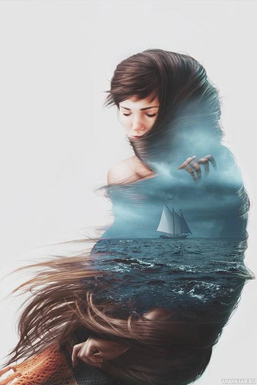 long hair and an ethereal appearance, sitting in front of what appears to be a painting. She is wearing a light-colored dress and has her hair swept back. In the background, there's a ship sailing on turbulent waters under