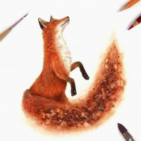 red coloring around its muzzle and ears. Below the fox's front feet, there's a swirl of colors that could be interpreted as a tail or perhaps a piece of
