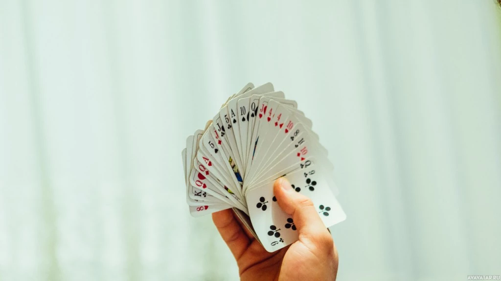На картинке изображена рука человека, держащая колоду игральных карт. Карты находятся в вентиляторном спреде, а туз пик виден в верхней части палубы. Этот тип изображений обычно ассоциируется с покером или другими карточными играми.