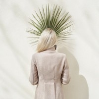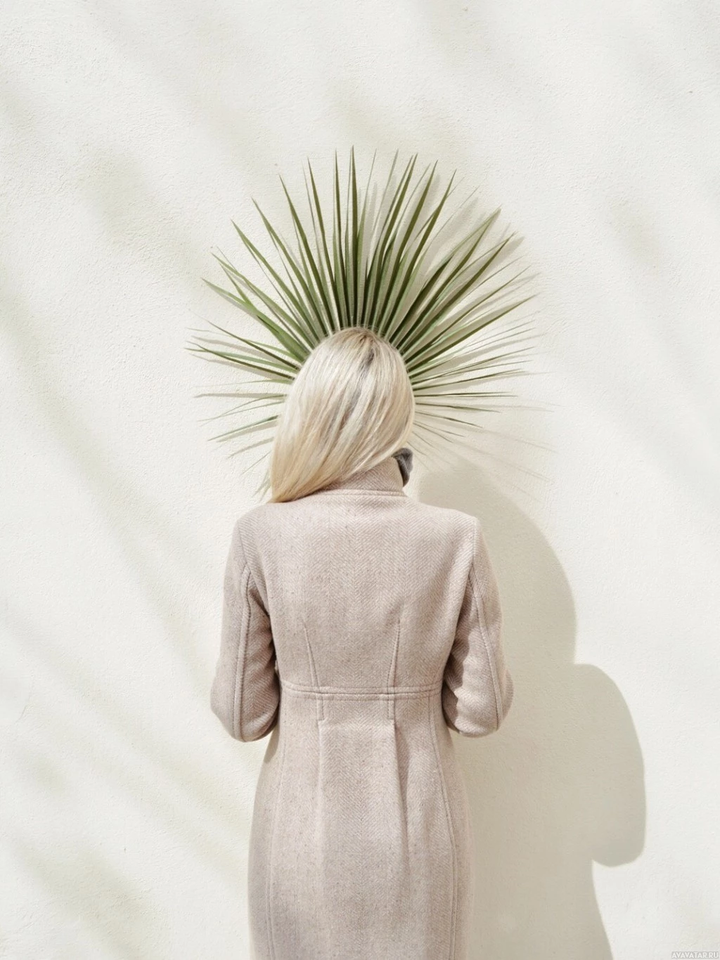 cool weather. In front of her head is a decorative piece that looks like a cactus or desert plant, possibly for a photo shoot or