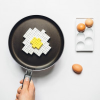 a frying pan with an egg cooking on top. In the background, there's a small tray or dish containing what appears to be additional eggs and possibly some kind of molds or silicone shapes that might resemble
