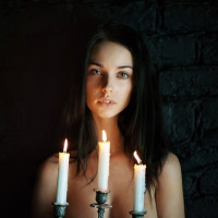 lit candles in front of her, creating a symmetrical pattern. The background is dark, suggesting a low-lit or nighttime setting, possibly adding to