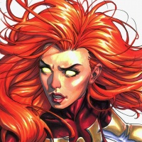 a stern expression on her face and is wearing what appears to be superhero-style costume, consisting of black and gold accents. The text "X-Man" is visible on the bottom right corner of the image, indicating that she might be associated with the X-Men comic