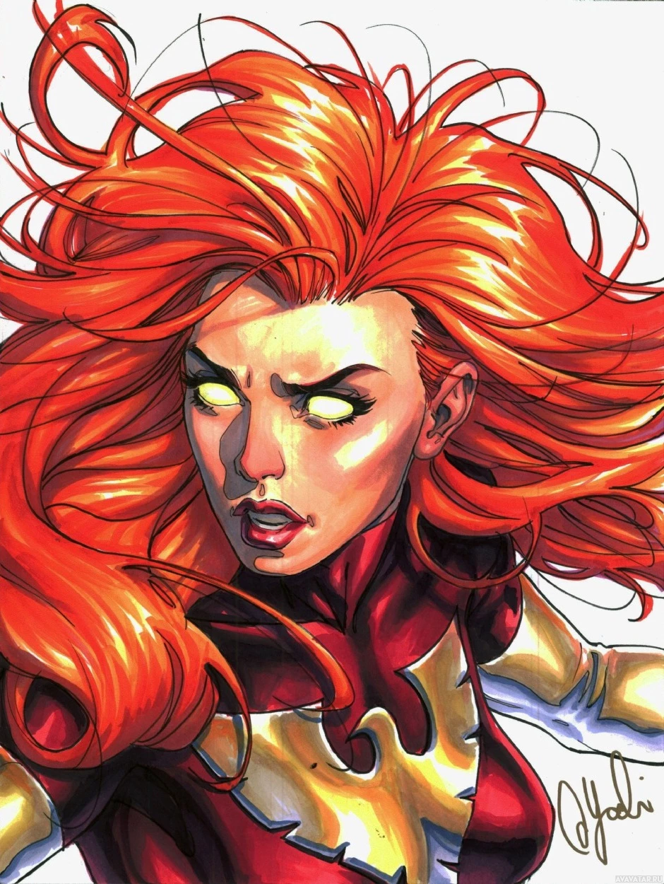 a female character with vibrant red hair, styled in a dynamic manner that suggests movement. She has