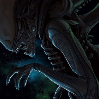 movie series. It is a highly detailed and realistic illustration of a Xenomorph, which is known for its distinctive appearance with a humanoid shape but with