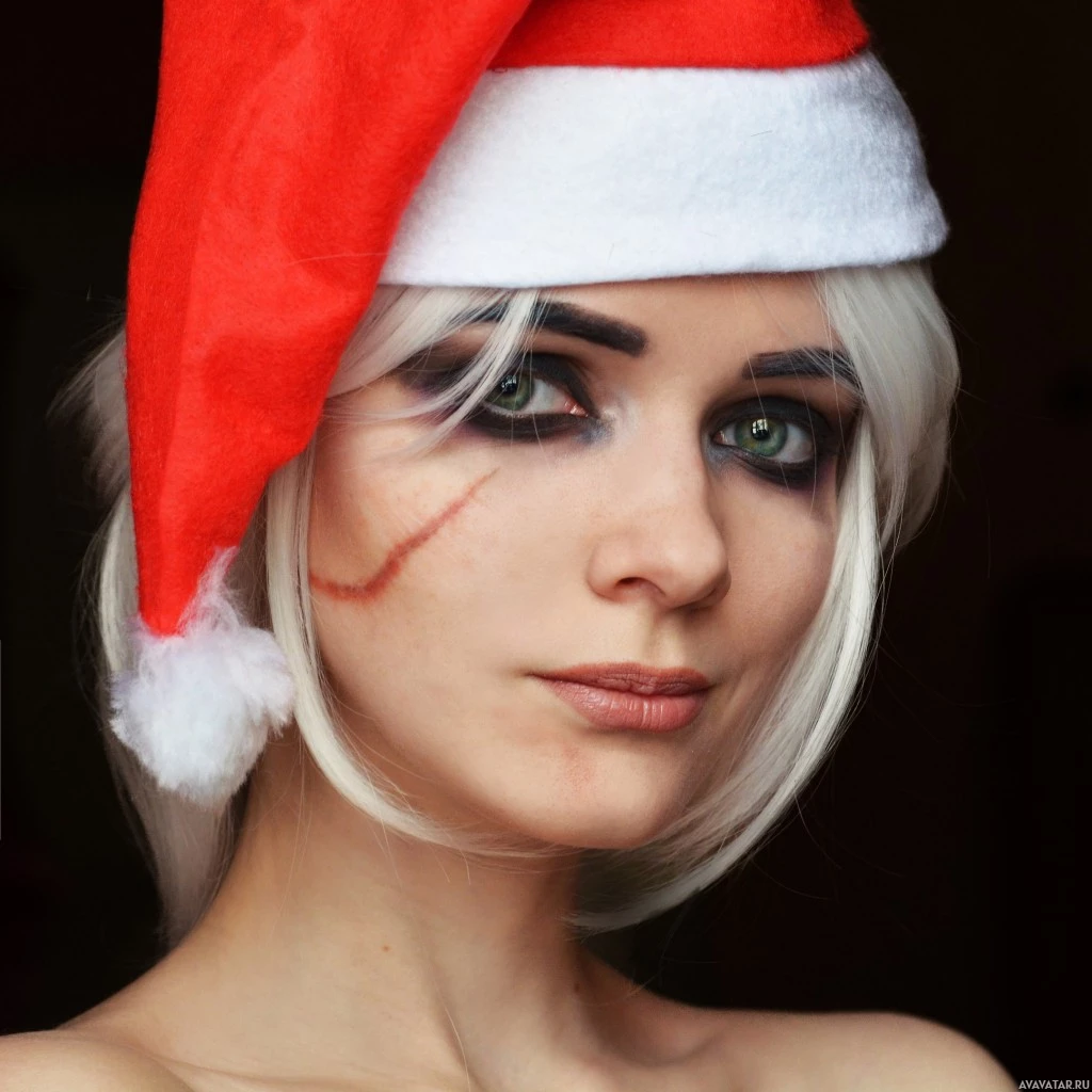 a Santa Claus hat and what appears to be makeup, including dark eye shadow, lipstick, and possibly white streaks on the face. The individual has
