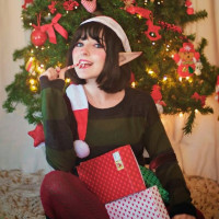 holiday decorations like garlands, ornaments, and bows. The person's attire, along with the festive tree and gifts, suggests that this is likely a photo taken during the Christmas season.