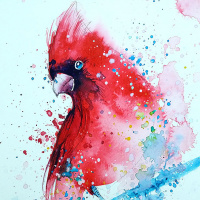 a red cardinal bird. It is set against a backdrop that seems to be an abstract, splashy