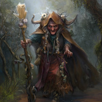 a long robe, a hat with large antlers (possibly representing a connection to nature), and holding what looks like a staff or wand in one hand. The character has