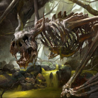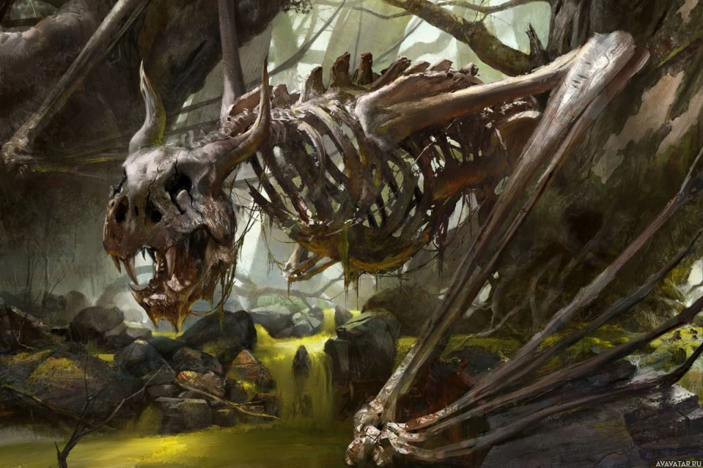 a fantasy scene featuring a skeleton that resembles the head and upper body of a dragon. The skeleton is large, with prominent bones that give it a menacing appearance. It's set in an eerie landscape, possibly within a cave or