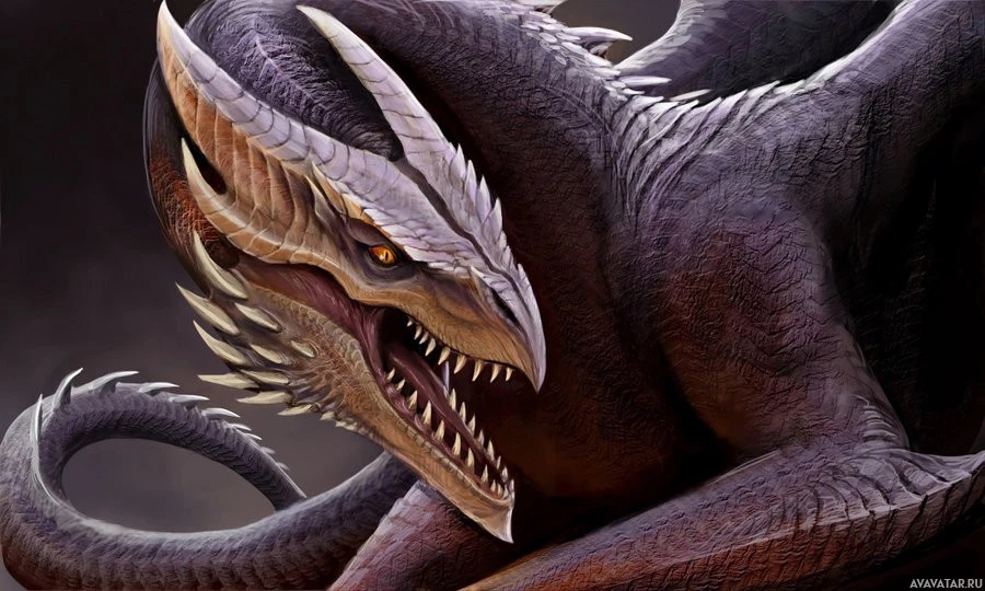 На картинке изображен дракон в стиле фэнтези. Он имеет угрожающий вид с острыми зубами, большими глазами и змеиной структурой тела. Это существо обычно ассоциируется с мифологией и жанрами фэнтези.