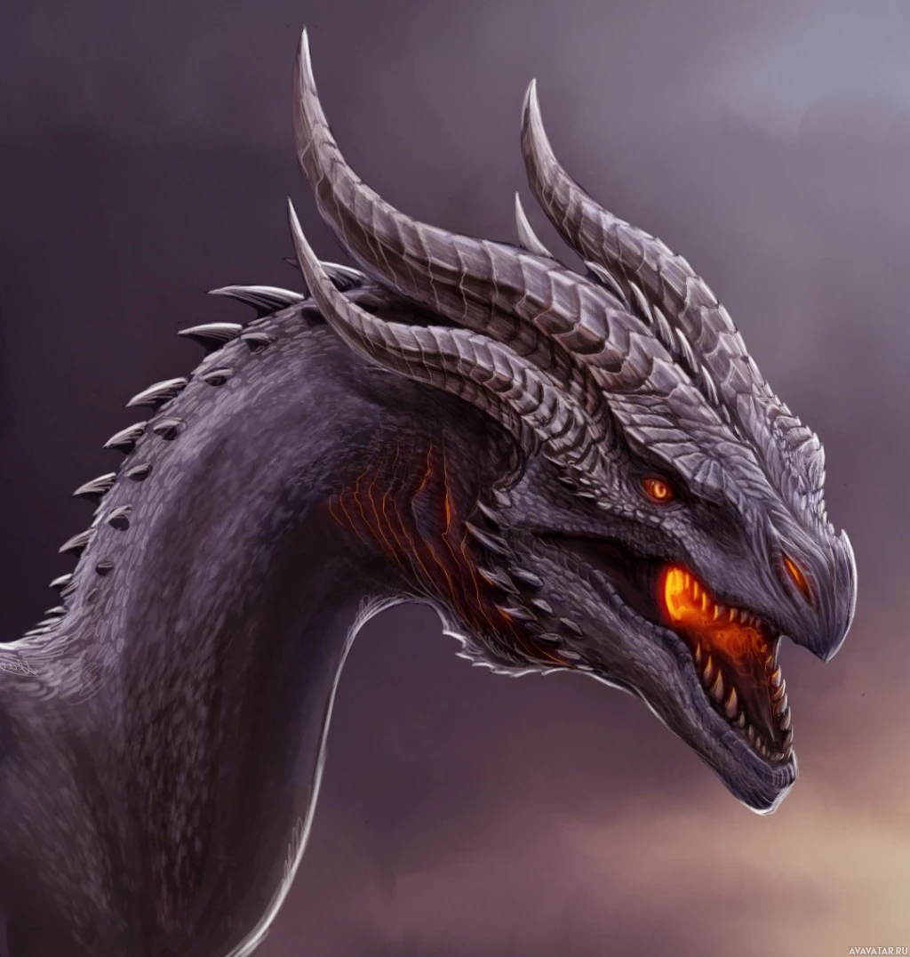 a fantastical creature resembling a dragon. It has a prominent head with horns, eyes that glow or appear to be on fire, and