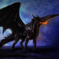 a night sky. The creature is depicted with intricate details that suggest it might be from