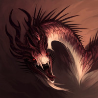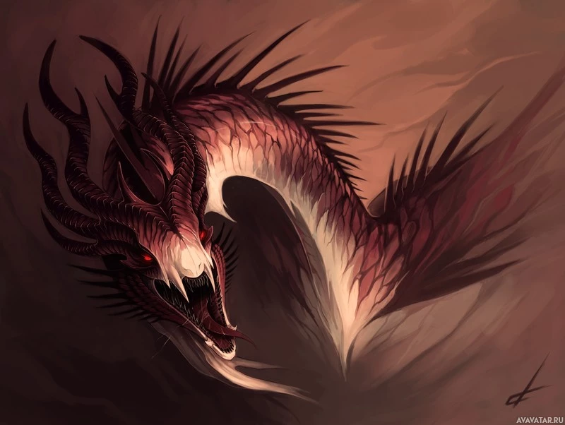 The image depicts a fantasy-style dragon with a menacing appearance. It is illustrated with a red and black color scheme, giving it