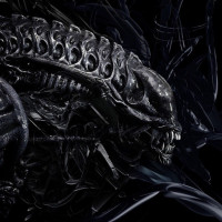The image shows a creature from the "Aliens" movie series. It is an extraterrestrial predator known for its distinctive armored exoskeleton and acidic blood. These creatures are iconic and often referred to as Xenomorphs, which have become a staple in science fiction and horror genres.