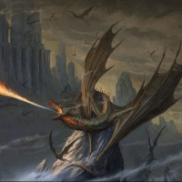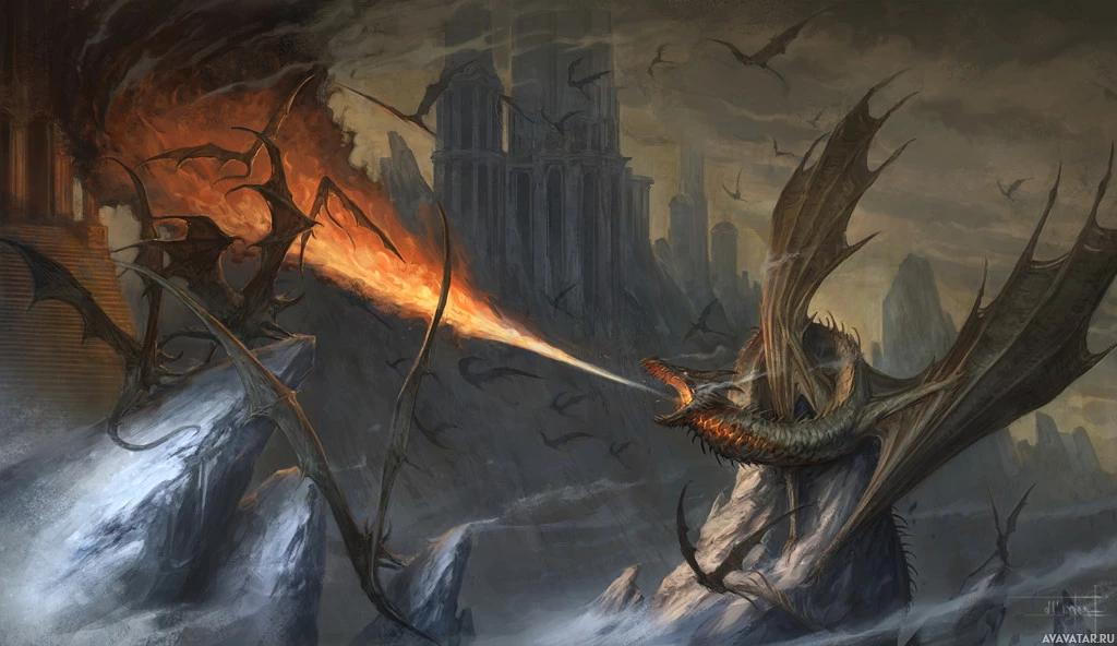 a fantasy scene with a dragon in the midst of an intense battle. There is