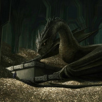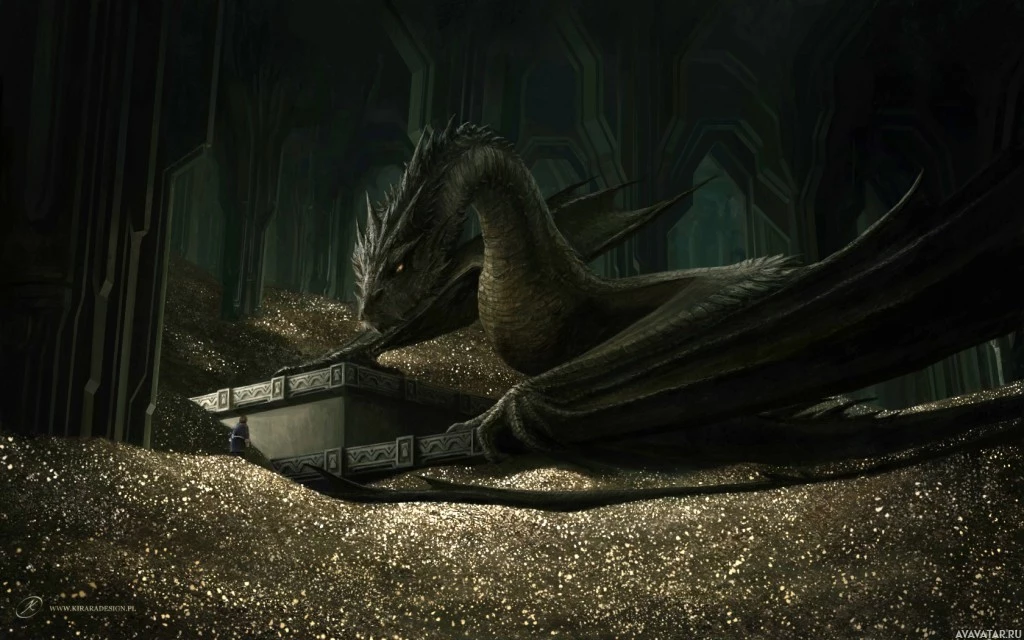 the character Smaug from the "The Hobbit" series, where he is depicted as a powerful, greedy dragon who hoards treasure in his lair. The dragon's scales have