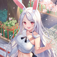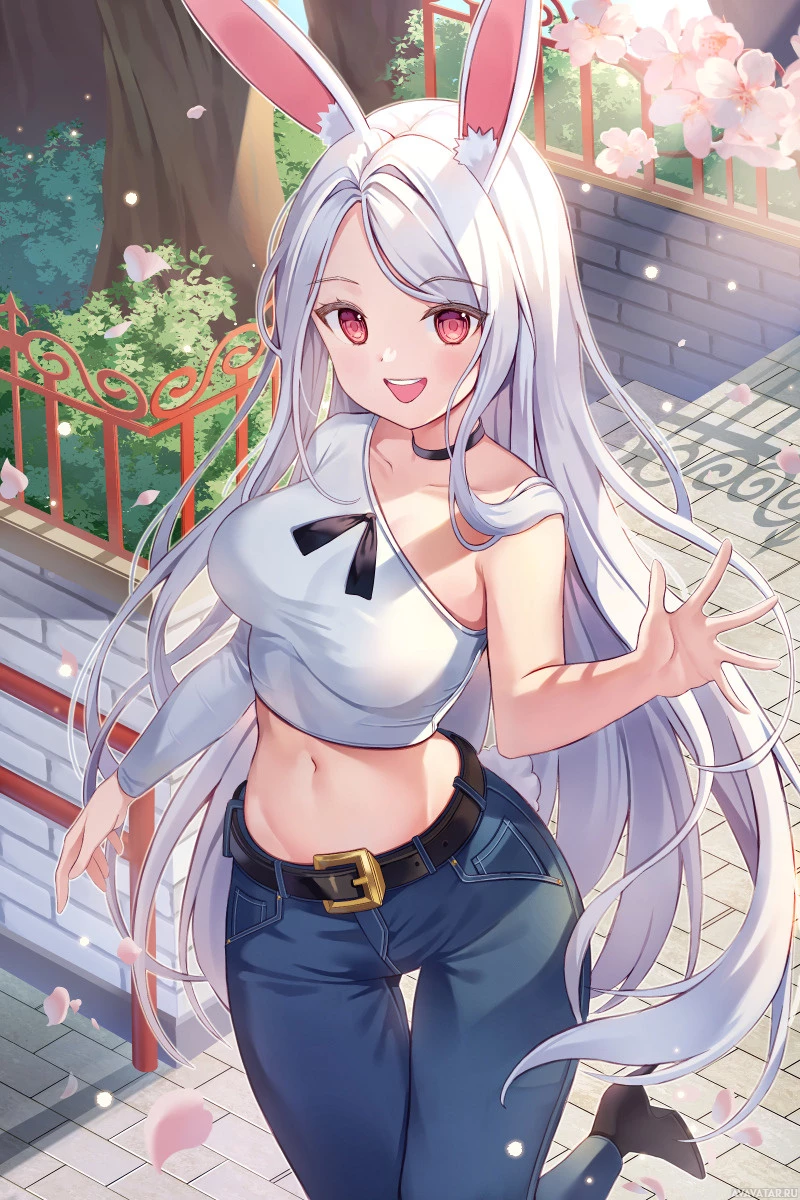 female character with white hair and a cheerful expression. She is wearing a casual outfit consisting of a high-waisted pant,