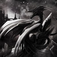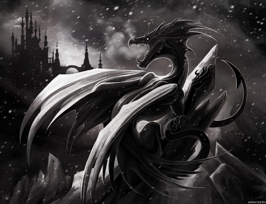 stormy sky above. Below the dragon, there are silhouettes of what look like castles or