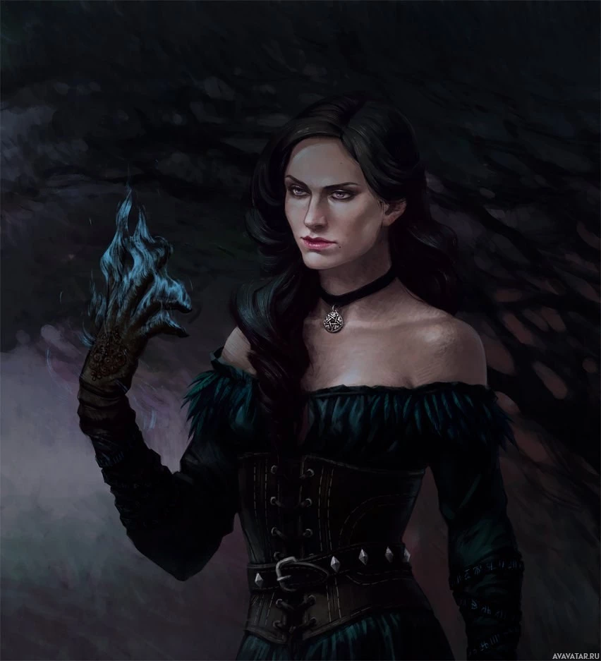 dark hair. In her hand, she holds a staff with a flame-like emblem at its top. The background has an eerie,