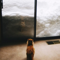 room setup. The cat seems intrigued by the scene outside, possibly indicating it's not used to such conditions or simply observing something interesting out there.