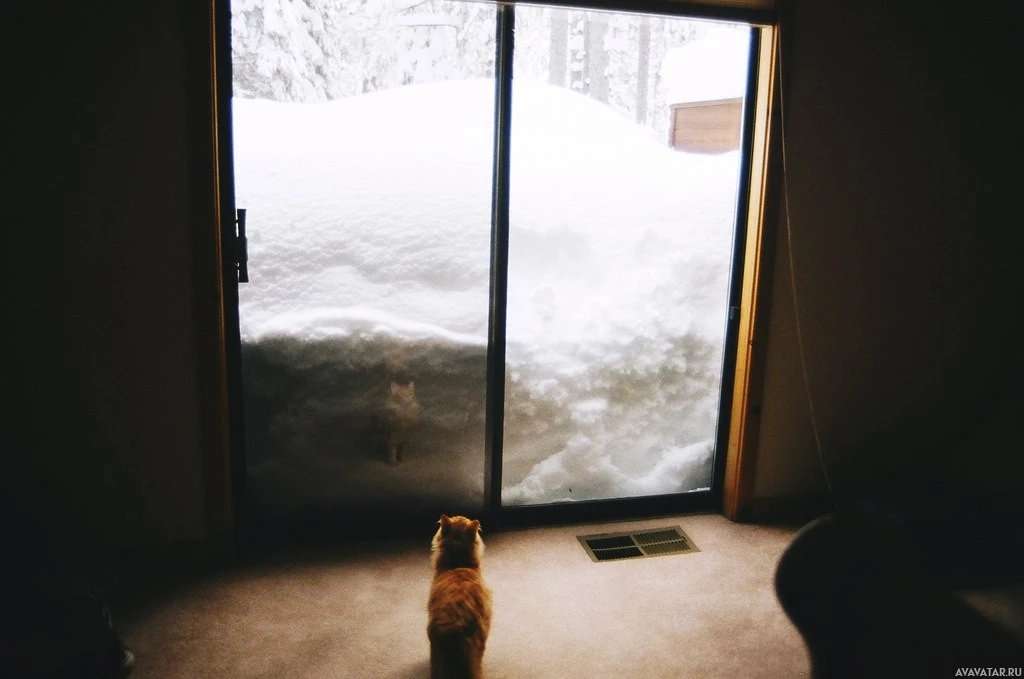 The image shows a cat standing on what appears to be a snowy floor indoors, looking out through